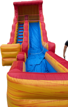 Inflatable 18 ft Volcano Water Slide. Experience an extreme lava adventure with this blow-up slide, decorated with bright red, orange and yellow colors. Whether you are having a summer get together or a backyard party you have found a unique option to entertain your guests with. Kids and adults can participate in the fun, of course. Climb through the side of the item and slide down into a splash pool or landing bed, depending on usage. You can use it as a water slide or a dry slide, just make sure to select the correct option on the drop-down menu. Perfect for house parties. Book it online now! We service Orange County and Los Angeles.