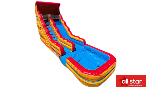 Inflatable 18 ft Volcano Water Slide. Experience an extreme lava adventure with this blow-up slide, decorated with bright red, orange and yellow colors. Whether you are having a summer get together or a backyard party you have found a unique option to entertain your guests with. Kids and adults can participate in the fun, of course. Climb through the side of the item and slide down into a splash pool or landing bed, depending on usage. You can use it as a water slide or a dry slide, just make sure to select the correct option on the drop-down menu. Perfect for house parties. Book it online now! We service Orange County and Los Angeles.