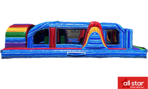 Welcome to our Marble Obstacle Course! This vibrant inflatable attraction boasts two lanes of exhilarating challenges. It needs 15 x 26 of space clearance. Bursting with color and excitement, participants will navigate through crawling tunnels, pop-up obstacles and climbing walls. Perfect for birthdays, corporate events, or any occasion, our obstacle course promises endless laughter and unforgettable memories for all ages. Experience the thrill of victory as you conquer each colorful obstacle on this dynamic adventure! Its compact size makes it ideal for house party setups, ensuring convenient entertainment right in your own backyard!