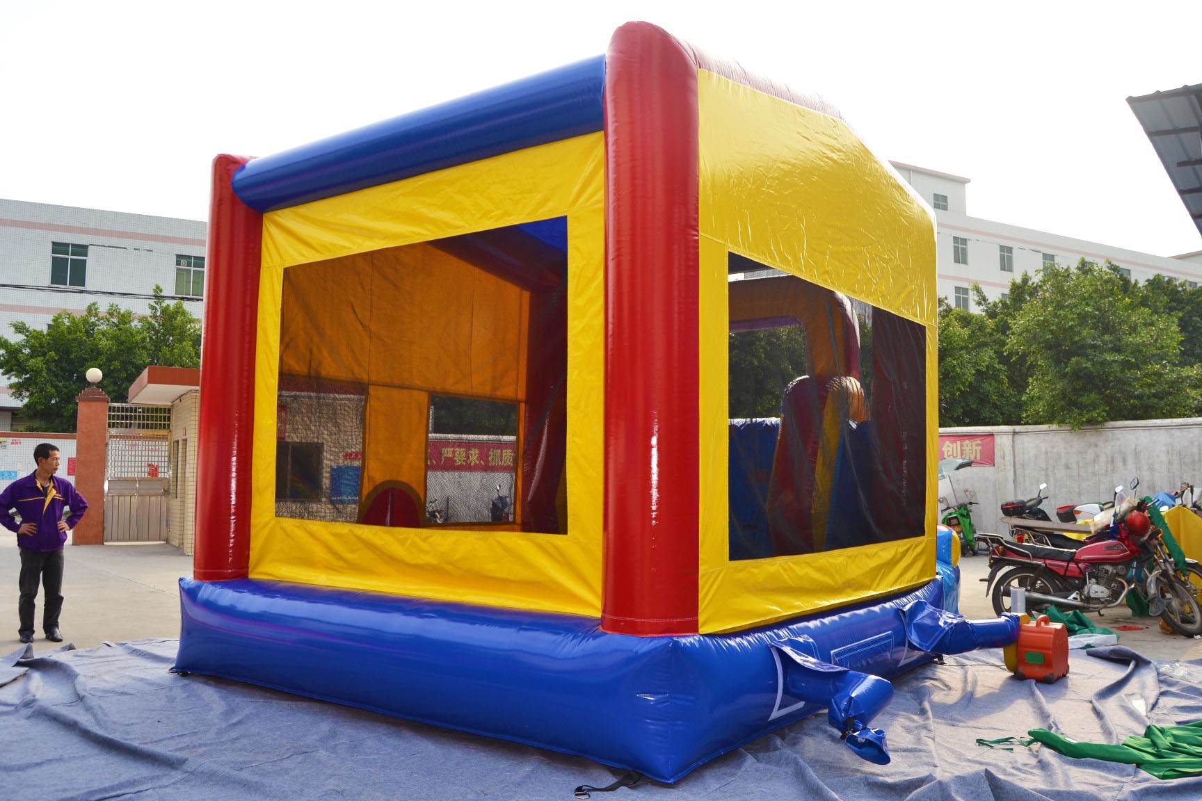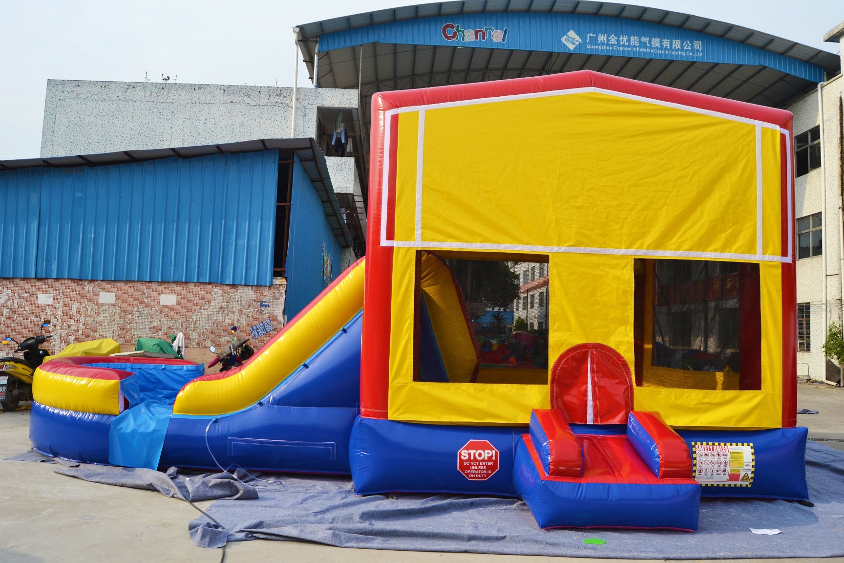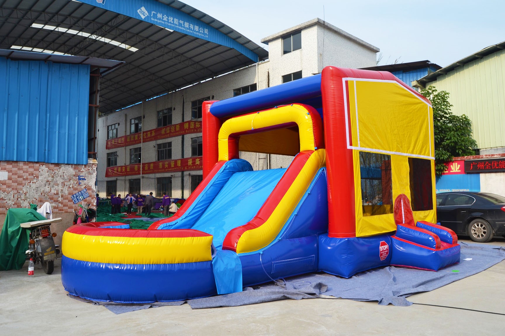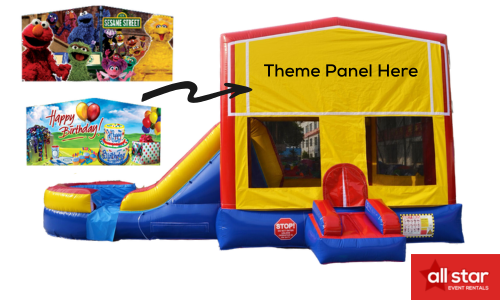 This is our 3 in 1 Mini combo. It's a small combo suitable for small spaces. It has a mashing net on all of its sides makes it easier for parents to supervise their kids inside. It includes a bouncing area, a climbing and sliding area as well an inflatable basketball hoop inside (we no not provide the mini basketballs for it). We can also customize the top front of the item with the various themed banners we carry. Call us now and ask for availability!