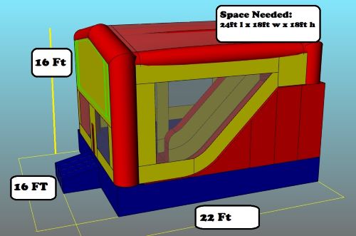 Its actual size is 16L x 22W x 16H feet. You will only need a Space required 18L x 24W x 18H feet of clearance space for this standard bouncer. The bounce house holds 8 children from 2-12 years old or 6 from 9-15 years old. It can be set up on grass, asphalt or concrete. There is an additional fee to set up on concrete or turf. We will need a 3-4 feet access clearance and a clear path on the entrance (if the setup is in your backyard). The slide on this item has only one lane. Please make sure it is used properly.