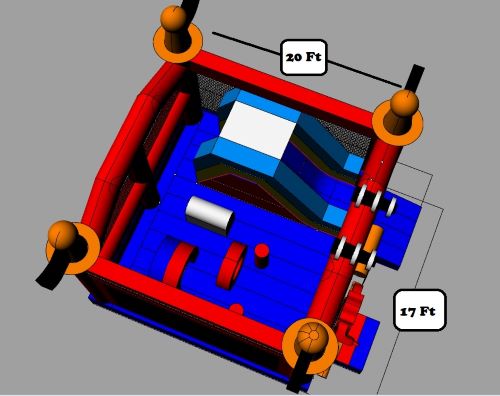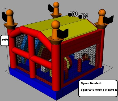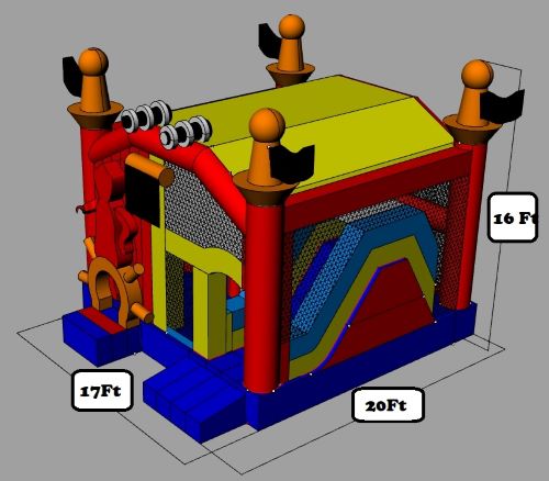 This is a 20 FT L X 17FT W X 16FT H combo and you will need a space clearance of 22FT L X 19FT W X 18FT H for it. It holds 8 children from 2-12 years old or 6 children from 9-15 years old. Safety Information: