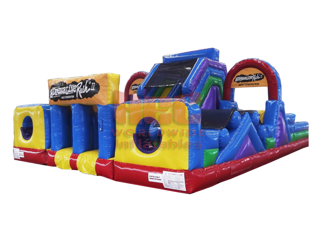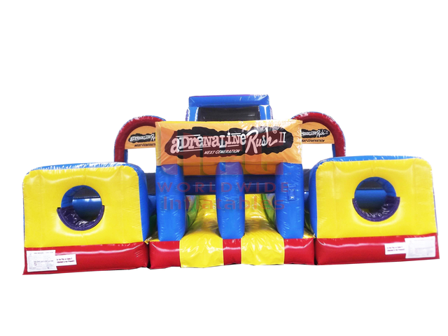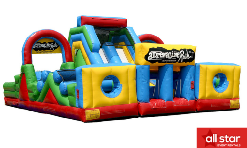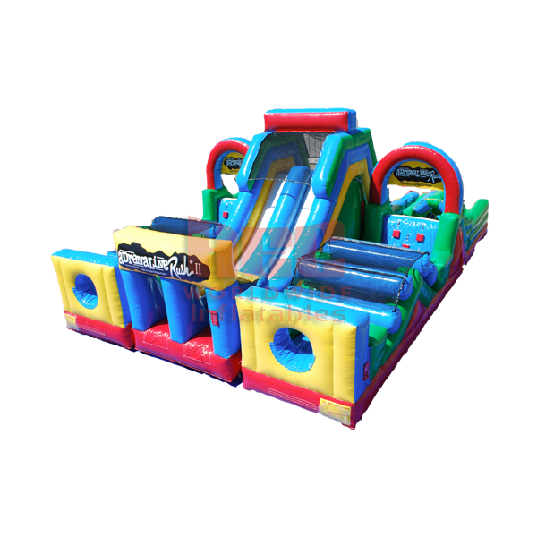 This is our Adrenaline Obstacle Course inflatable. This is a gigantic item, filled with amazing features that will keep your guests fully entertained . It includes two obstacle lanes, where contestants have to climb up, slide down and make their way through a variety of inflatable obstacles! When they get to the end of the item, they will have access to the middle double lane slide in which participants will finish their way through this inflatable. You will get a high rotation of children in this inflatable. The most practical way to use it is have 2 contestants race through this gigantic item at a time. Reserve it now!