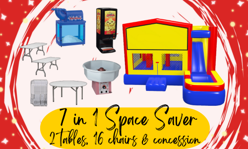 7 in 1 Space Saver combo, concession machine, 16 white folding chairs and two 6 ft long tables.