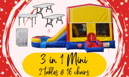 Choose this awesome package for an exclusive price! It includes a 3 in 1 Mini combo, two tables and 16 chairs.