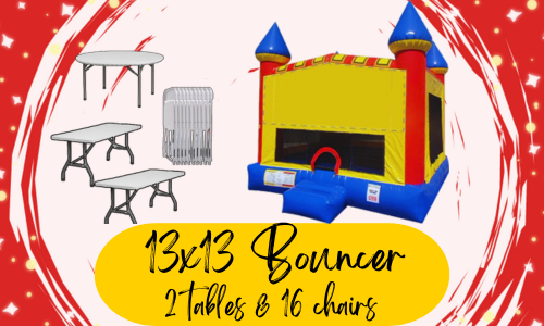 You can choose any 13 x 13 jumper to apply to this promotion except for the branded ones. You need a clearance space of 15 x 15 feet for the inflatable and a power outlet less than 50 feet away from the set-up area. If this package is for a park, a single circuit generator will need to be added to the order. We can add a panel to this inflatable for no additional fee. Call us to check availability on our over 100 themes. Take advantage of this amazing deal and let's get on the jumping! |