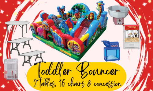 Enjoy this awesome toddler package! Get a toddler combo, two tables, sixteen chairs and a concession machine for a bundle deal. For the combo, you can choose between the following combos: