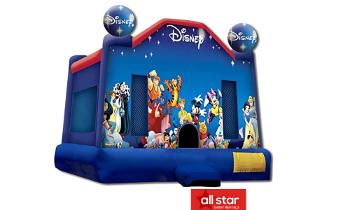 Come bounce around in the Wonderful World of Disney with this magical moon bounce. It is decorated with most of Disney's most iconic characters. You will only need 15 by 15 feet of clearance space for this standard size jumpy. Its actual size is 13 by 13 feet. It holds 8 children from 2-12 years old or 6 from 9-15 years old. It can be set up on grass, asphalt or concrete. Set up on turf or concrete is subject to additional sandbag fees. We will need a 3-4 feet access clearance and a clear path on the entrance.