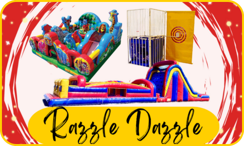 Our Razzle Dazzle Package features an array of giant, colorful inflatables that will spark joy in the hearts of both kids and adults. Let the little ones loose in our specially designed toddler bouncers, while the bigger kids experience towering slides that offer an adrenaline rush to whimsical obstacle courses that challenge and delight. There's an inflatable adventure or super splash dunk for everyone in the family. For convenience, this package is customizable and includes one item from each of the three listed categories. Due to high demand, ALL packages must be booked over the phone to guarantee availability |